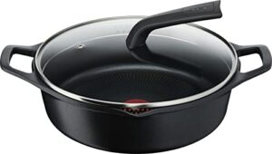 日の出の柔らかな光がキッチンに差し込む中、「ティファール 玉子焼き器 14×18cm 鋳物なのに軽くて使いやすい IH ガス火対応 PFOAなどの有害物質不使用 こびりつきにくさ長持ち 『キャストライン アロマ プロ シチューポット』 ブラック E25118」を手に取ると、その軽さに驚きます。